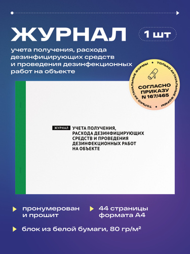Журнал учета получения, расхода дезинфицирующих средств и проведения дезинфекционных работ на объекте, 22 листа, прошит (1шт)