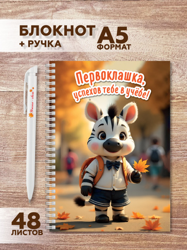 Блокнот А5 (48 листов) "Первоклашка зебра", ручка в наборе