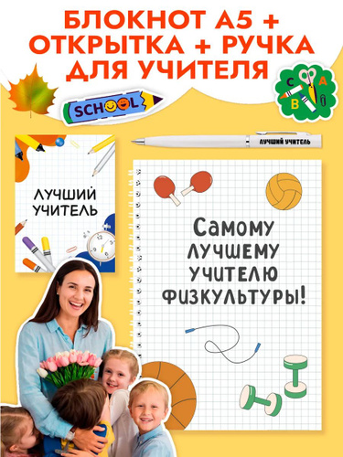 Подарочный набор с ручкой, блокнотом и мини открыткой учителю по физкультуре на Выпускной