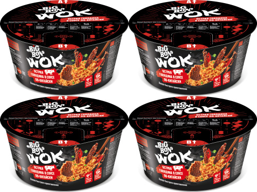 Лапша Big Bon Wok с говядиной и соусом по-китайски острая быстрого приготовления, комплект: 4 упаковки по 85 г