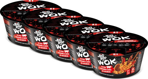 Лапша Big Bon Wok с говядиной и соусом по-китайски острая быстрого приготовления, комплект: 5 упаковок по 85 г