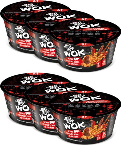 Лапша Big Bon Wok с говядиной и соусом по-китайски острая быстрого приготовления, комплект: 6 упаковок по 85 г