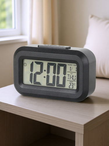 Настольные электронные часы будильник с термометром, черный корпус, крупные арабские цифры, календарь дата, таймер, подсветка, повтор, измерение температуры, 9х5.5х2.7см, AAAx2 (не в комплекте)