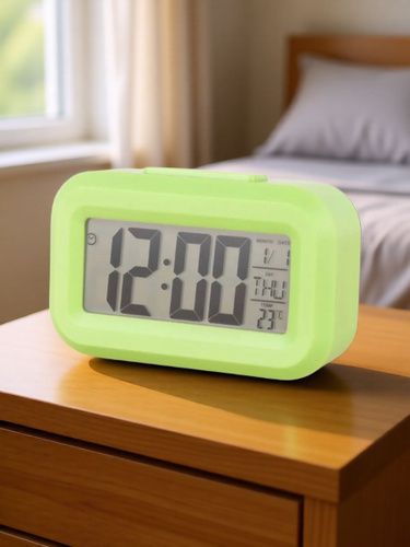 Настольные электронные часы будильник с термометром, зеленый корпус, крупные арабские цифры, календарь дата, таймер, подсветка, повтор, измерение температуры, 9х5.5х2.7см, AAAx2 (не в комплекте)