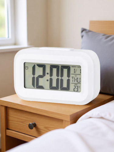Настольные электронные часы будильник с термометром, белый корпус, крупные арабские цифры, календарь дата, таймер, подсветка, повтор, измерение температуры, 9х5.5х2.7см, AAAx2 (не в комплекте)