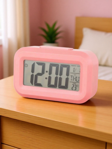 Настольные электронные часы будильник с термометром, розовый корпус, крупные арабские цифры, календарь дата, таймер, подсветка, повтор, измерение температуры, 9х5.5х2.7см, AAAx2 (не в комплекте)