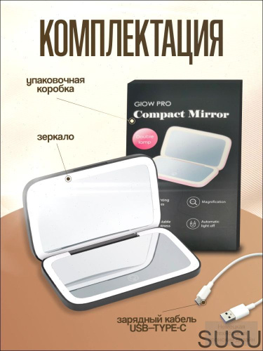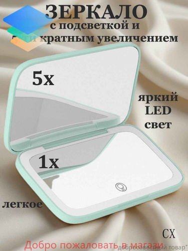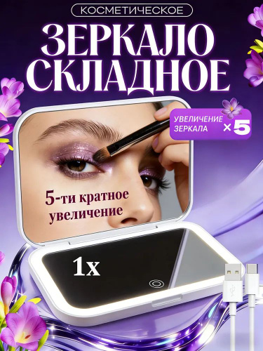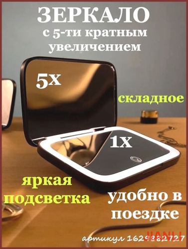 Зеркало косметическое с подсветкой и увеличением 5х. Складное, карманное зеркало для макияжа