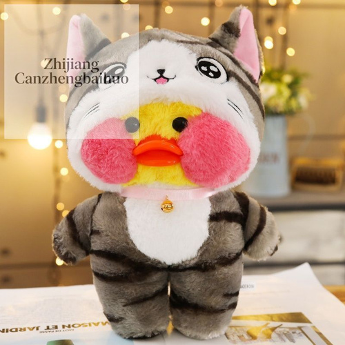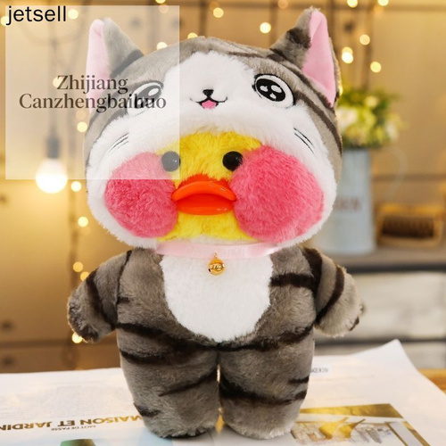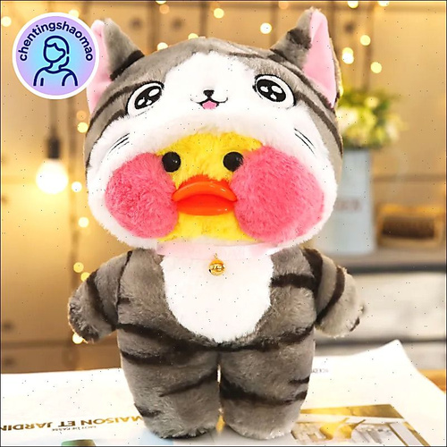 Мягкая игрушка желтая утка / Уточка лалафанфан в одежде Кошка, 30 см
