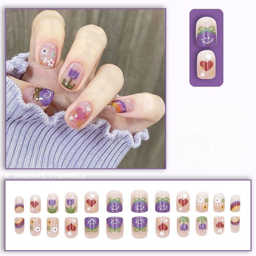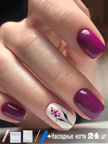 Набор Из 24 Штук Накладных Ногтей + Клей + 4 Инструмента,розово-фиолетовые Цветы,Короткие Накладные Ногти
