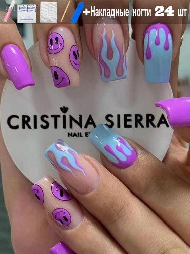 Набор из 24 штук накладных ногтей + клей + 4 инструмента,Фиолетовый узор в виде смайлика,Длинные Ногти Накладные
