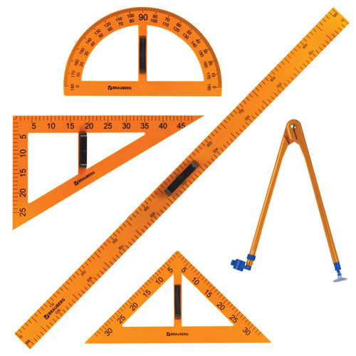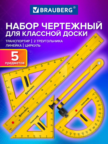 Набор чертежный для школьной доски: линейка 100 см, 2 треугольника, транспортир, циркуль для геометрии и черчения в школу, Brauberg