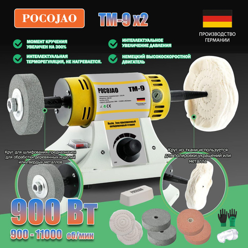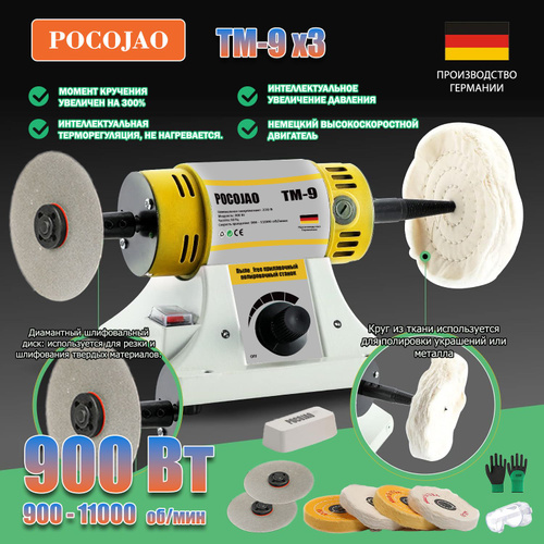 POCOJAO-TM-9X3(900W) Полировальный станок для ювелирных изделий буфер для стоматологических работ и токарный станок в комплекте 4 тканевых диска, 2 алмазных шлифовальных диска, защитное 015