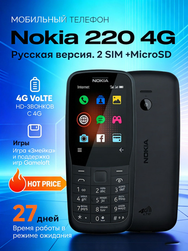 Nokia Мобильный телефон Nokia 220 4G (2019), Кнопочный телефон с поддержкой 4G VoLTE, двумя SIM-картами, большим экраном 2.4 дюйма и долгим временем работы от батареи, 1200 мА·ч, FM-радио, прочный корпус., черный матовый, черно-серый