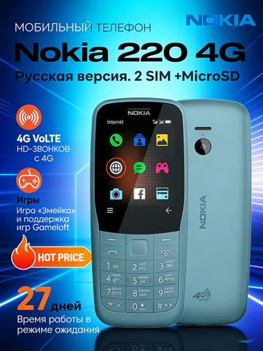 Nokia Мобильный телефон Nokia 220 4G (2019), Кнопочный телефон с поддержкой 4G VoLTE, двумя SIM-картами, большим экраном 2.4 дюйма и долгим временем работы от батареи, 1200 мА·ч, FM-радио, прочный корпус., голубой