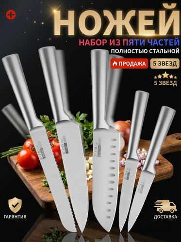 Профессиональный набор из 5 ножей для кухни: шеф-повара, для хлеба, универсальный, для фруктов, для обвалки полностью стальной