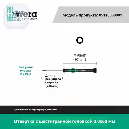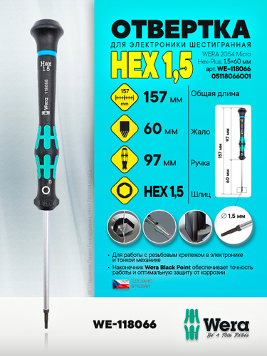 Wera Kraftform Micro 2054, отвертка HEX 2, 2 x 60 мм, для электроники, WE-118068