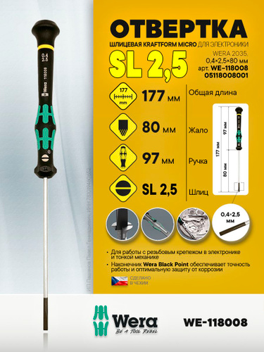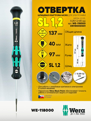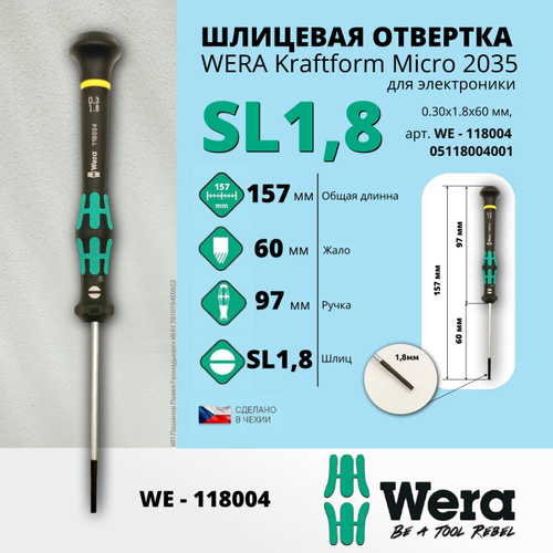 Отвертка SL1.8 шлицевая WERA Kraftform Micro 2035 для электроники, 0.30x1.8x60 Мм, WE-118004