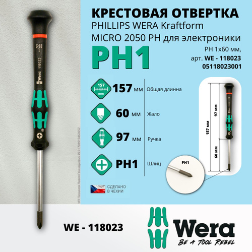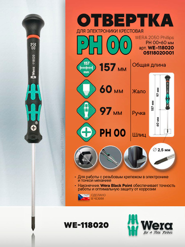 Отвертка PH00 крестовая Phillips WERA Kraftform Micro 2050 PH для электроники, PH 00 / 60 мм WE-118020