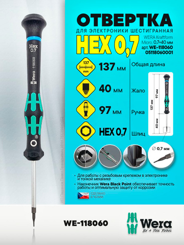 Отвертка шестигранная WERA Kraftform Micro 2054 для электроники, 0.7x40 мм, 118060