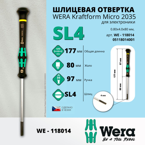Отвертка SL2 шлицевая WERA Kraftform Micro 2035 для электроники, 0.40x2x60 Мм, WE-118006