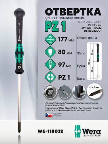 Отвертка крестовая Pozidrive WERA Kraftform Micro 2055 PZ для электроники, PZ 0 / 60 мм (WE-118030)