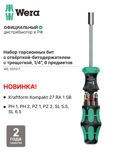 Набор бит с отверткой битодержателем c трещоткой, Kraftform Kompakt 27 RA 1 SB, 6 предметов, WE-051517