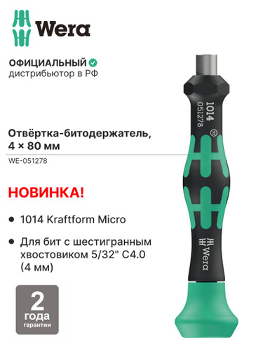 Отвертка битодержатель Wera Kraftform Micro для бит с шестигранным хвостовиком 5/32" 4 мм, WE-051278