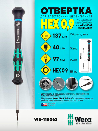 Отвертка шестигранная WERA Kraftform Micro 2054 для электроники, 0.9x40 мм (WE-118062) Чехия