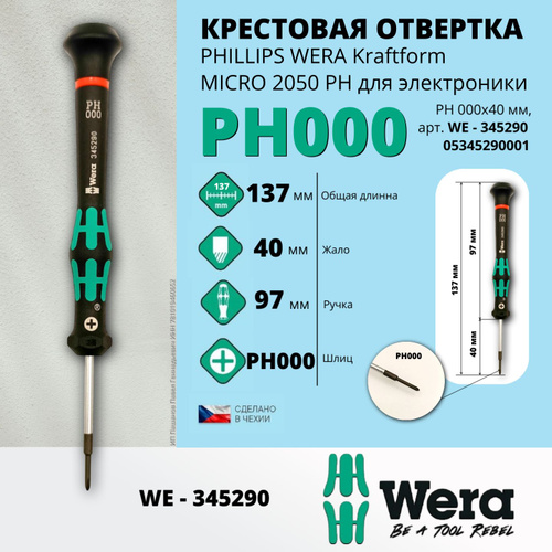 Отвертка крестовая Phillips WERA Kraftform Micro 2050 PH для электроники, PH 000 / 40 мм