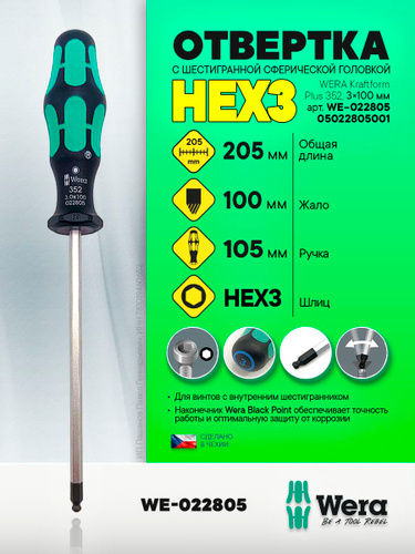 Отвертка HEX 3 с шестигранной сферической головкой WERA Kraftform Plus 352, 3 x 100 мм WE-022805