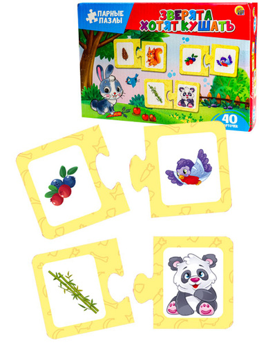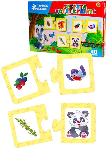 Парные пазлы "Зверята хотят кушать", развивающая настольная игра-головоломка, паззлы для малышей, складные картинки-половинки с животными, найди пару, 40 карточек