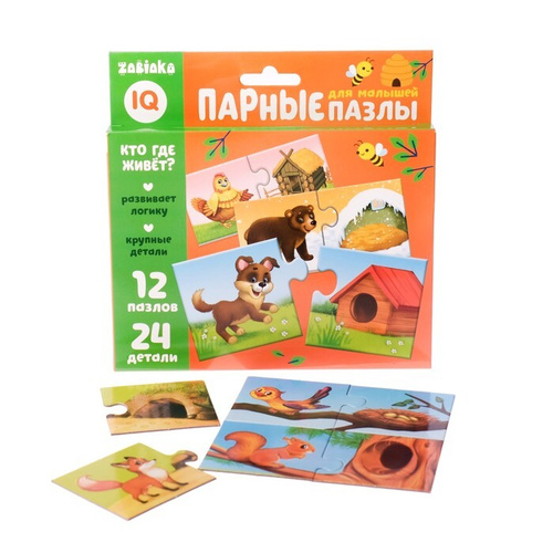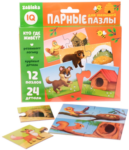 Парные IQ пазлы "Кто где живет?", логическая головоломка на ассоциации для детей, найди пару, 12 пазлов, 24 крупные детали, развитие памяти, внимания и мелкой моторики