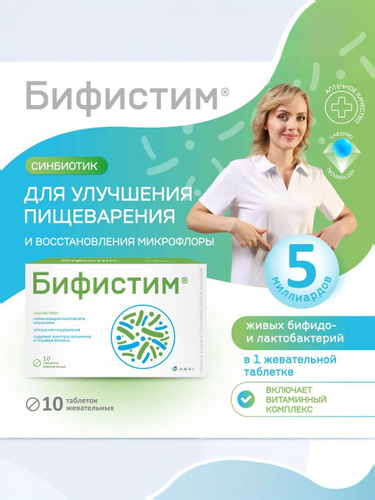 Бифистим. Синбиотик. Комплекс пробиотиков и пребиотиков с витаминами для улучшения пищеварения, 10 жевательных таблеток.