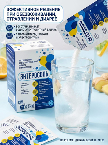 ЭНТЕРОСОЛЬ 10 саше-пакетов по 4,3г. с пробиотиком при обезвоживании организма, отравлении и диарее.