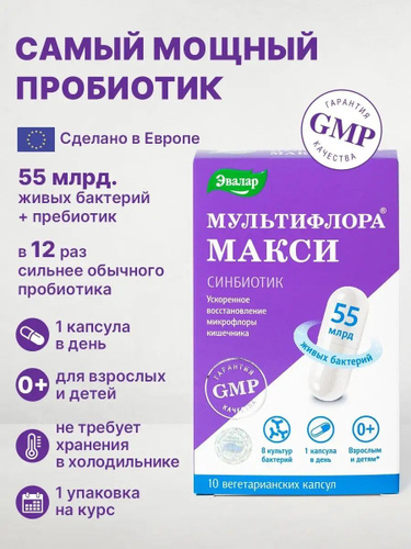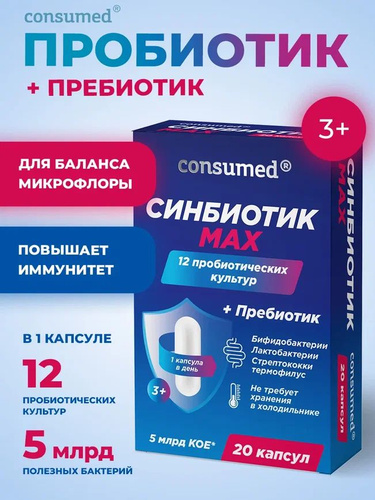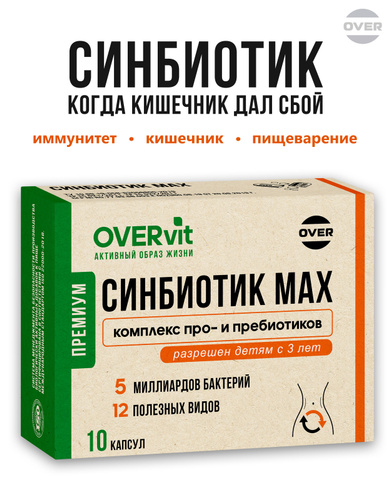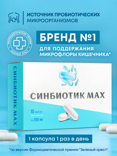 "Синбиотик MAX" (пробиотики + пребиотики) для взрослых, для быстрого восстановления микрофлоры кишечника, для взрослых и детей, 10 капсул
