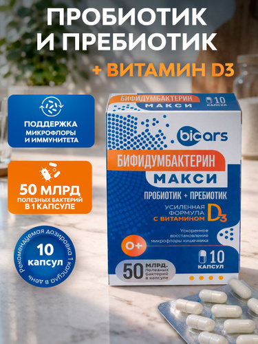 Бифидумбактерин МАКСИ капсулы №10 пробиотик+пребиотик с витамином D3 для взрослых и детей 0+