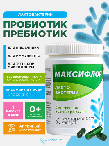 Пробиотик пребиотик Максифлор Лакто без диоксида титана. Лактобактерии для микрофлоры взрослых и детей с рождения, 30 капсул