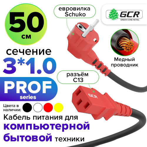 Короткий кабель питания PROF 50см GCR евровилка угловая Schuko - С13 черный кабель красные коннекторы 3*1,0mm
