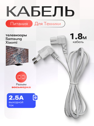 Шнур сетевой для ТВ Samsung 2 Pin 1.5 м, угловой, кабель питания 220 V для телевизора Самсунг