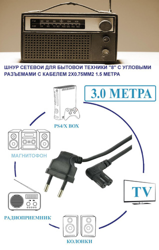 Шнур сетевой для бытовой техники "8" с угловыми разъемами с кабелем 2x0.75мм ,черный, 3.0м, 1шт.