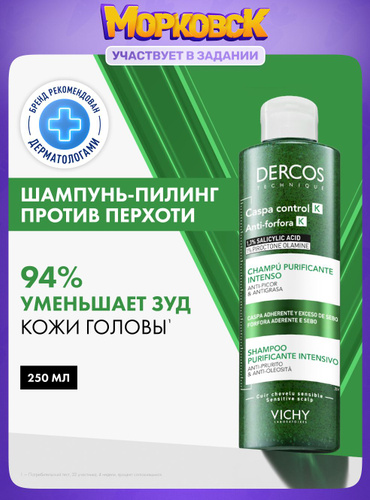 Vichy Dercos K Глубоко очищающий шампунь-пилинг для волос против перхоти, себореи и зуда с салициловой кислотой и ниацинамидом для отшелушивания и уменьшения жирности кожи головы, 250 мл