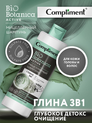 Compliment Мицеллярный шампунь ГЛИНА 3в1 для кожи головы и волос Глубокое детокс очищение от силиконов и укладочных средств BIOBOTANICA ACTIVE, 380мл