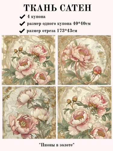 Ткань Сатен, "Пионы в золоте" отрез 43*173см , 4 купона 40*40см