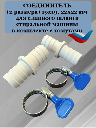 Соединитель (2 размера) 19х19 + 22х22 с хомутами бабочка (2 шт) для сливного шланга стиральной машины
