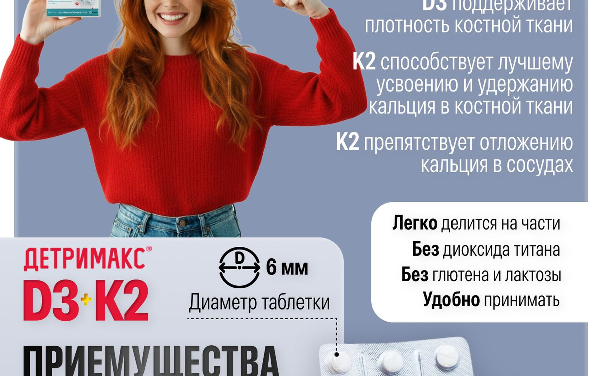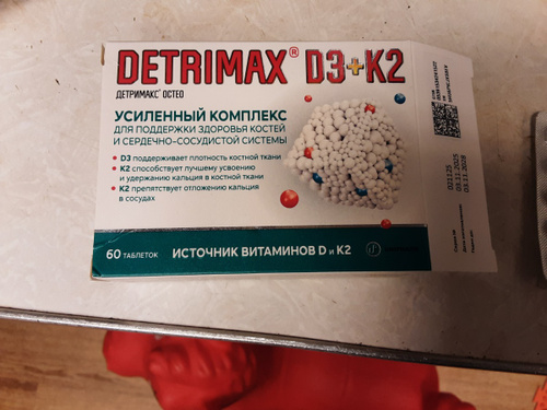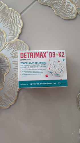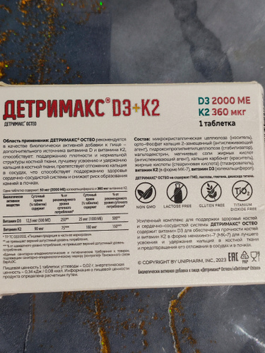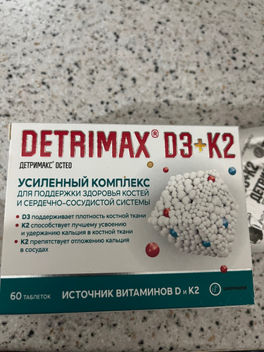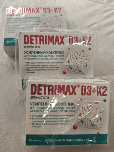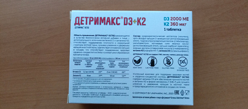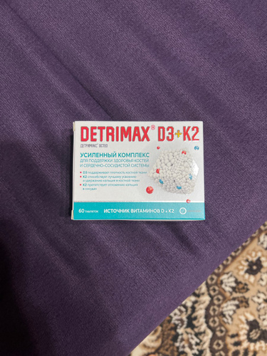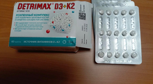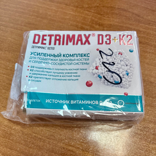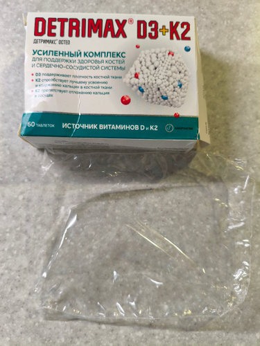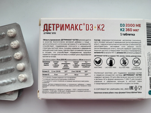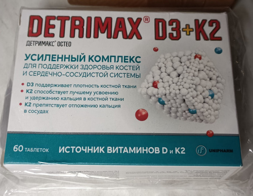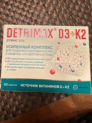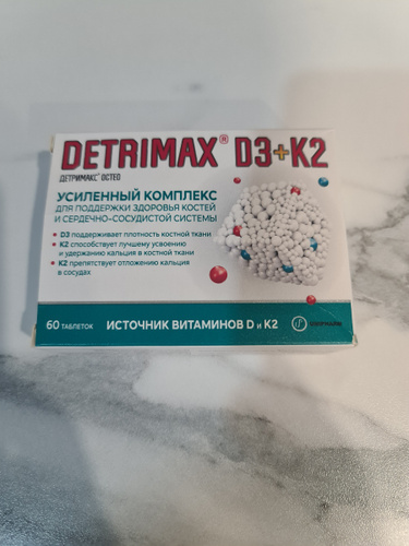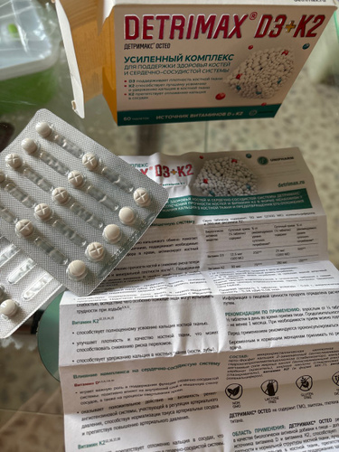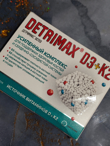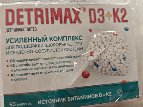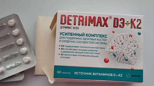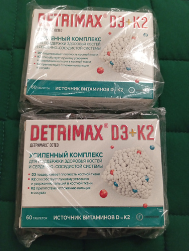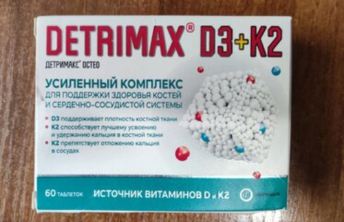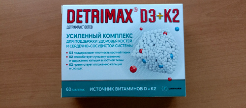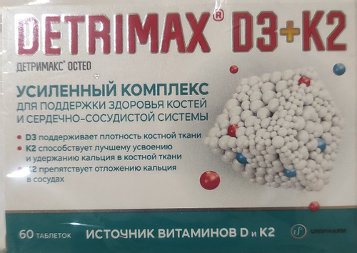 ДЕТРИМАКС ОСТЕО рекомендуется в качестве биологически активной добавки к пище — дополнительного источника витамина D и витамина K2, способствует: поддержанию плотности и нормальной структуры костной ткани, лучшему усвоению и удержанию кальция в костной ткани, препятствует отложению кальция в сосудах, что способствует поддержанию здоровья сердечно-сосудистой системы.