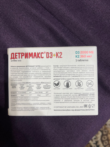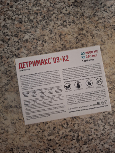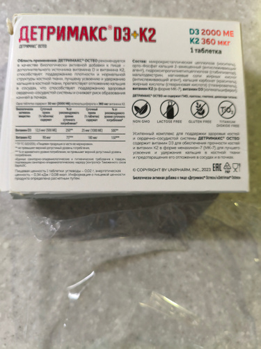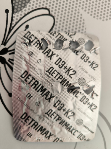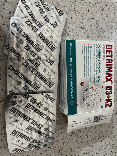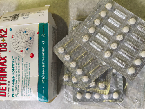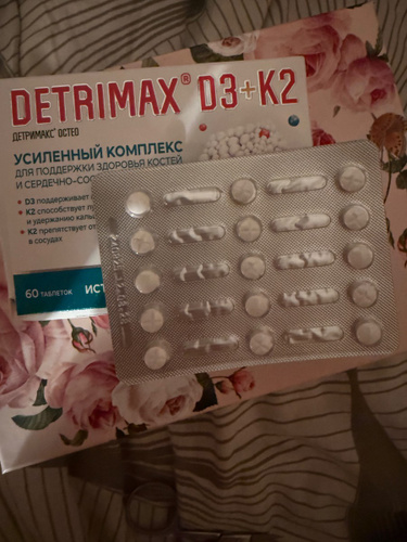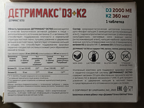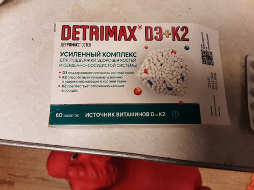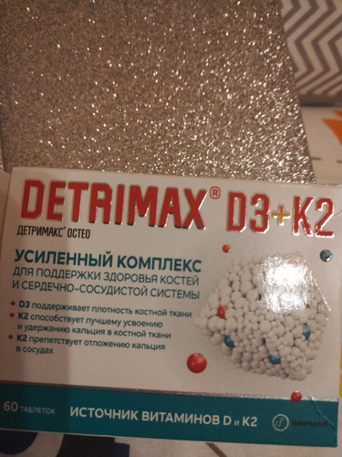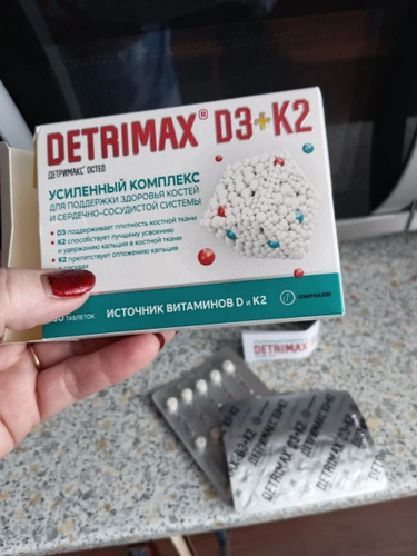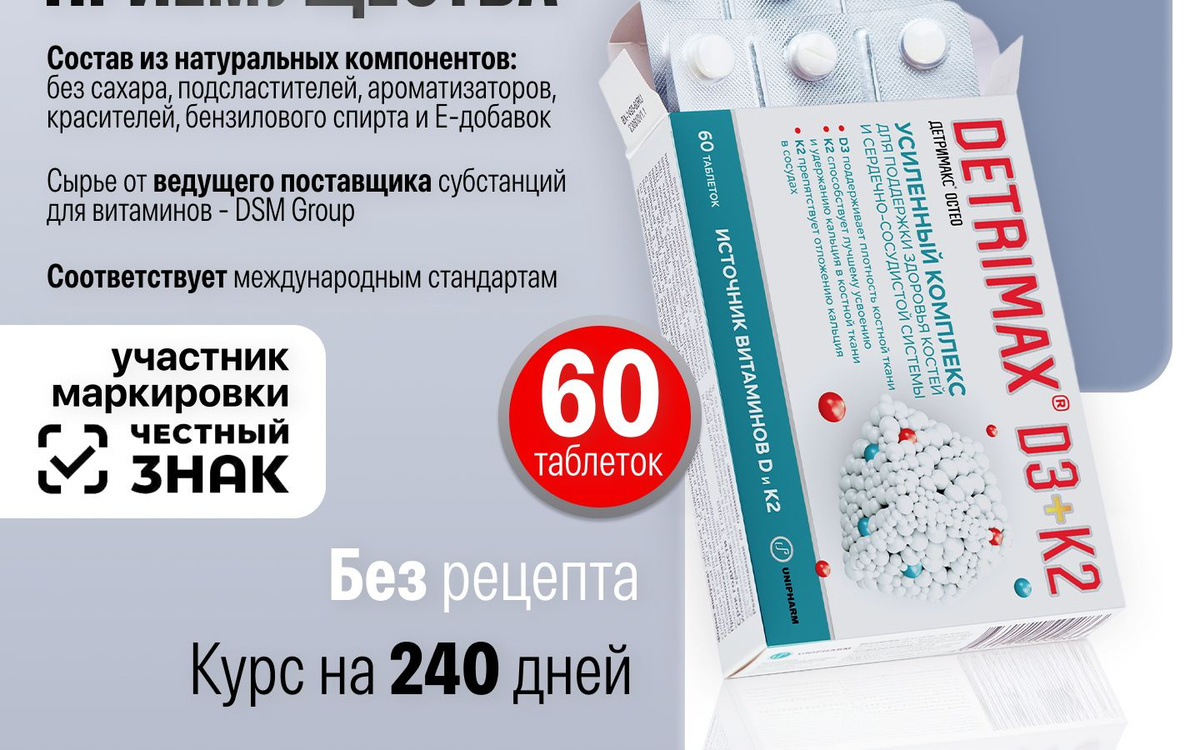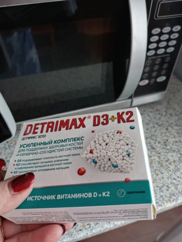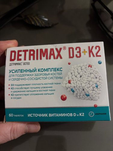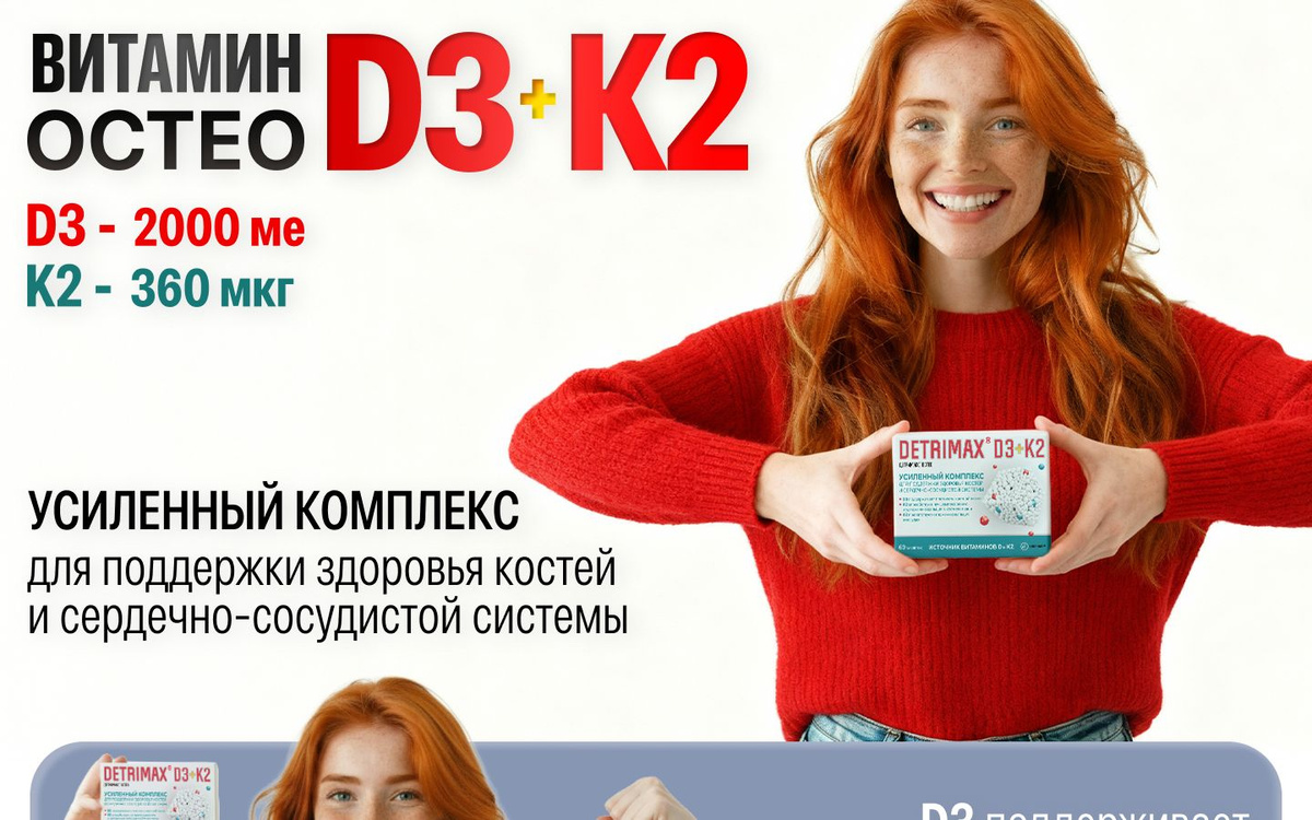 ДЕТРИМАКС ОСТЕО рекомендуется в качестве биологически активной добавки к пище — дополнительного источника витамина D и витамина K2, способствует: поддержанию плотности и нормальной структуры костной ткани, лучшему усвоению и удержанию кальция в костной ткани, препятствует отложению кальция в сосудах, что способствует поддержанию здоровья сердечно-сосудистой системы.