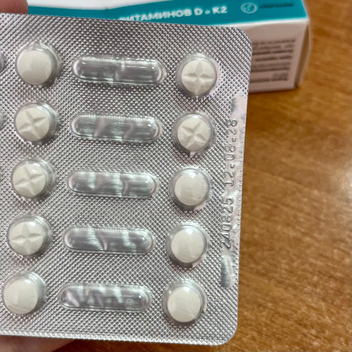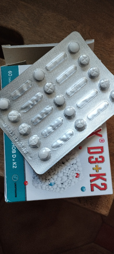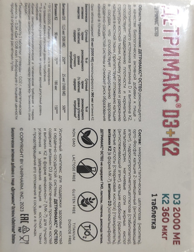 микрокристаллическая целлюлоза (наполнитель), ортофосфат кальция 2-замещенный (антислеживающий агент), гидроксипропилметилцеллюлоза (стабилизатор), мальтодекстрин, магниевые соли жирных кислот (антислеживающий агент), кальция карбонат (краситель), стеариновая кислота (эмульгатор), витамин K2 (в форме MK-7) витамин D3 (холекальциферол).