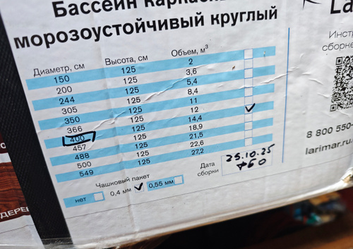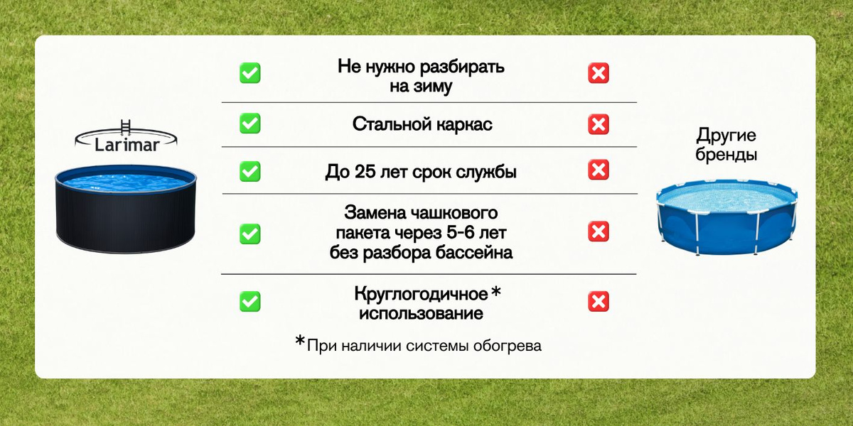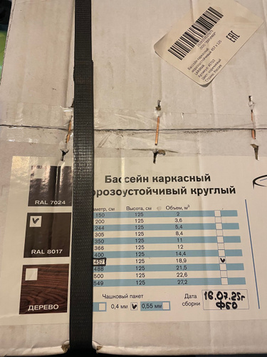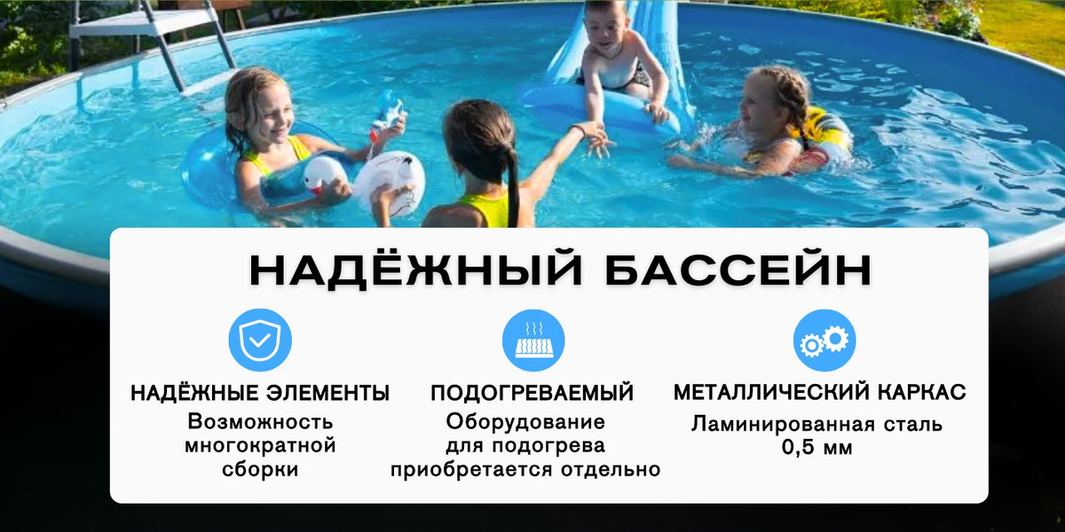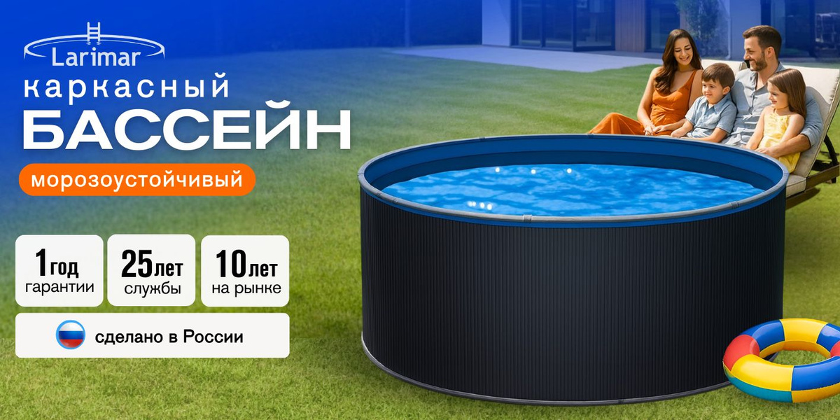 Бассейн каркасный круглый LARIMAR хорошо подойдет для дачи, сада и загородного дома. Морозоустойчивый каркасный бассейн предназначен как для наземной установки, так и для вкапывания в землю на произвольную глубину. Независимо от времени года и погодных условий, большой глубокий бассейн станет идеальным местом для активного отдыха, водных спортивных игр, отдыха на природе, плавания для детей и взрослых. Бассейны Ларимар выполнены из ламинированной листовой стaли толщиной 0,5 мм с поперечным профилированием. Многослойное полимерное ламинирование позволяет продлить срок эксплуатации бассейна до 25 лет. Монтаж, сборка производится за несколько часов и не требует профессиональных инструментов и навыков. После окончания летнего сезона не демонтируется, его не надо разбирать на зиму. Это стационарный бассейн всесезонной эксплуатации (при наличии эффективной системы подогрева). Бассейн поставляется без лестницы, фильтровального оборудования и соединительных шлангов. Для удобства транспортировки вы можете вскрыть коробку при получении и погрузить отдельно его составные части. Комплектация; Стальной лист ( 0,5мм) Чашковый пакет ПBХ (цвет голубой 0,4мм) Форcунка подачи воды Скиммер (устpойство для сбора грязевых частиц с поверхности воды) Фурнитура и крепежные элементы Инструкция по сборке бассейна (на русском языке).