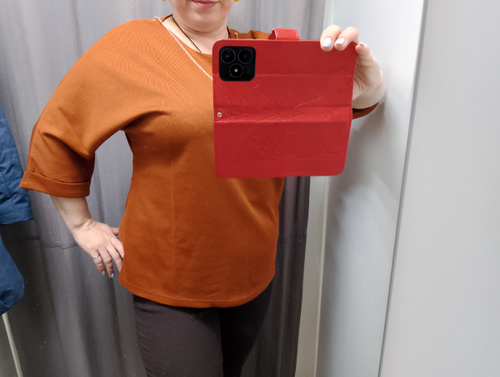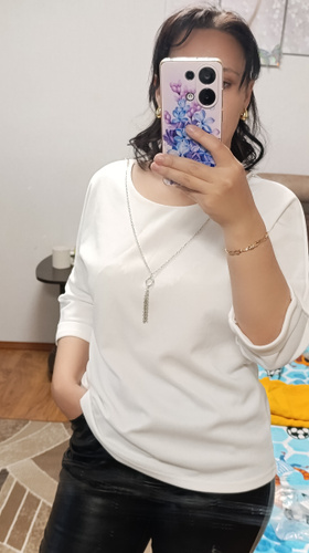 Ориентировалась по отзывам. Нормальная кофта. Не "Вау", как восхваляют. Брала два размера 50 и 52. Оставила 50. Немного свободной оказалась на мой 50-52.Для повседневной носки подойдёт. Украшение сняла.