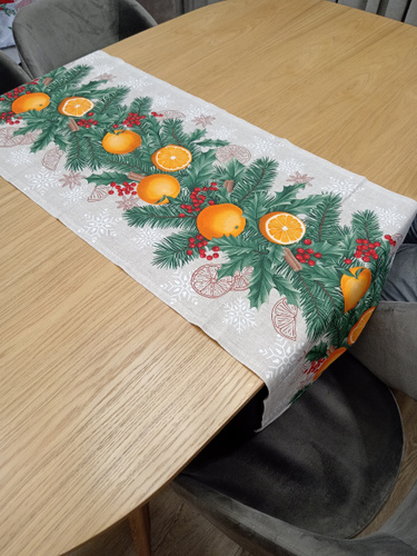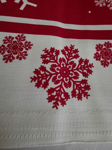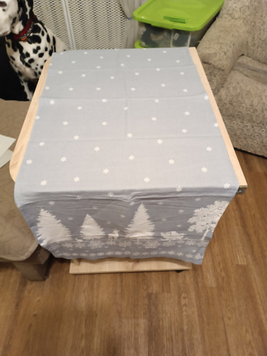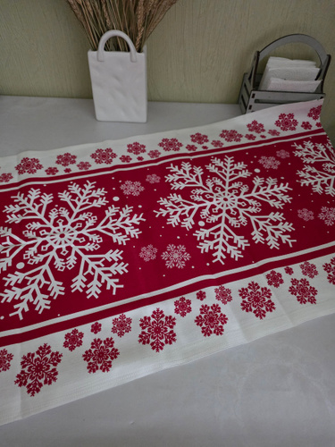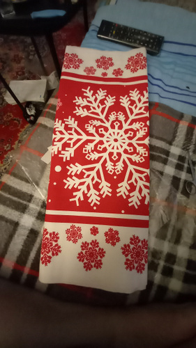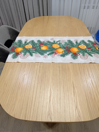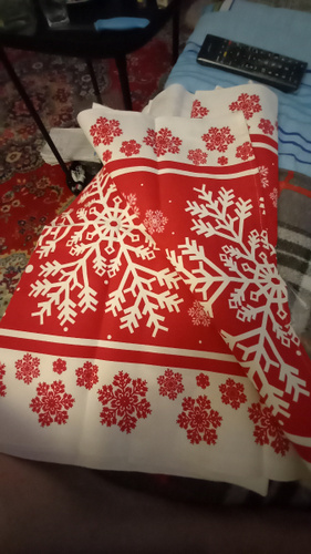Новый Год скоро! Душа просит подготовки🤣. Дорожка шикарная. Плотная, ткань по ощущениям 100% хлопок. Рисунок четкий. Цвет - красно/бордовый, пурпурный, тёмно-красный. У меня стол размером 135x81 см, дорожка свисает по 35-40 см по бокам. Очень красиво смотрится. 100% советую к покупке👍👍👍.